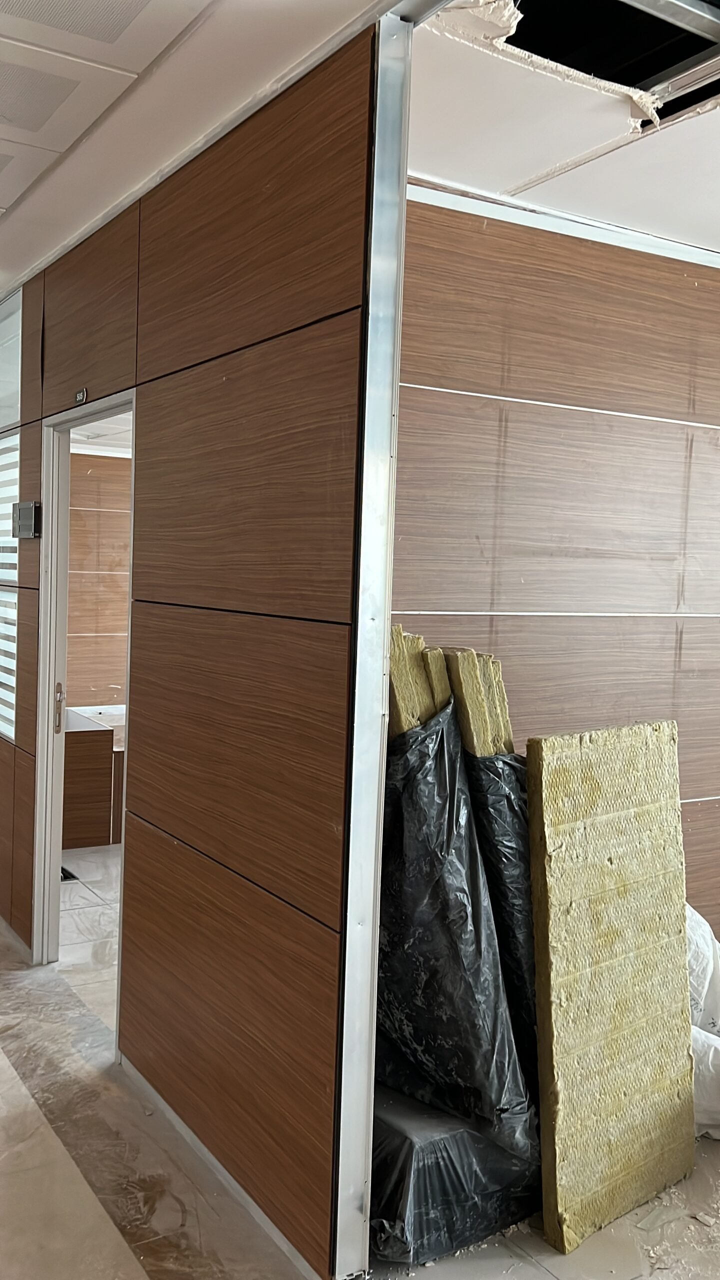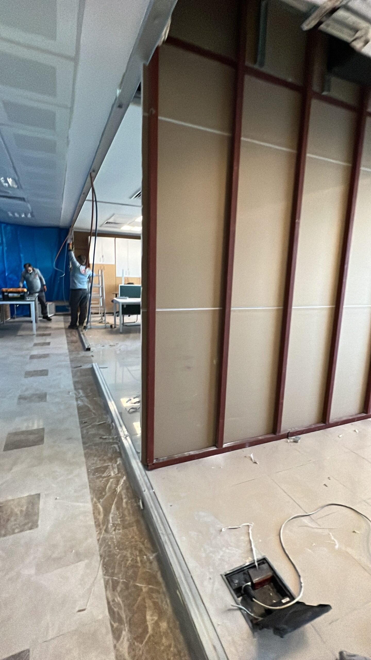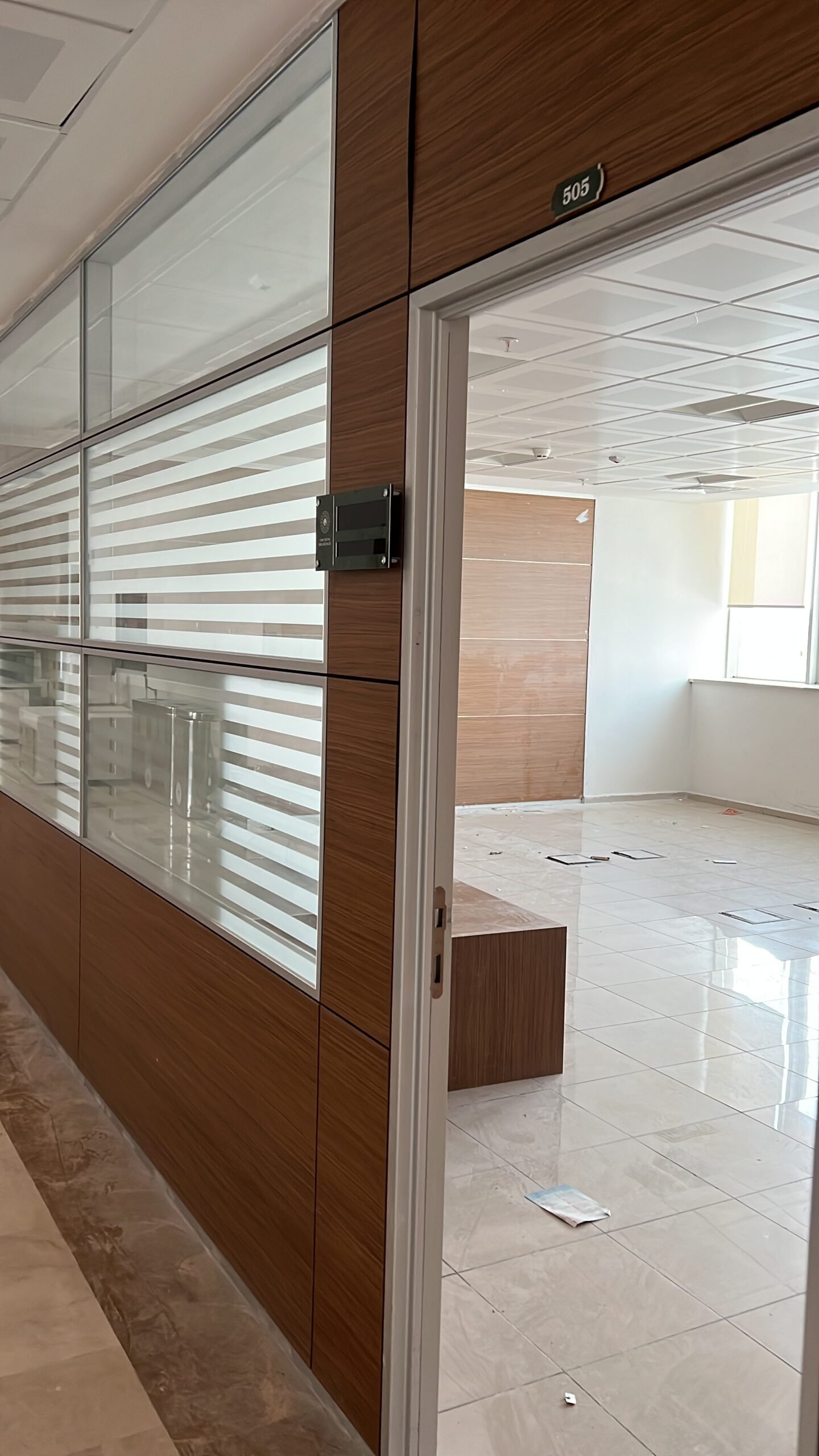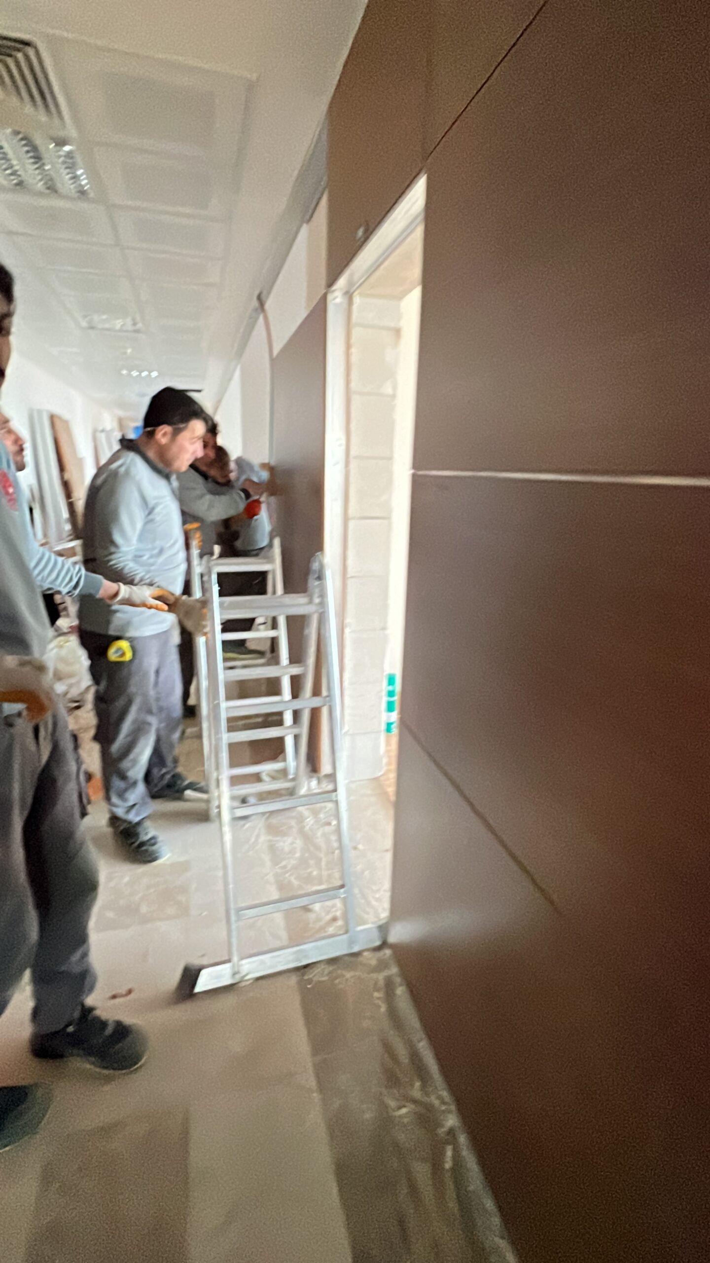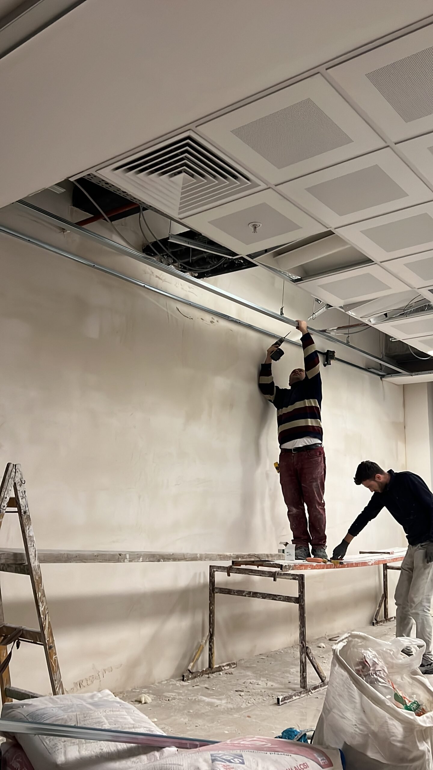 Duvar ve Tavan: Projeye uygun yeni gazbeton duvarların örülmesi, özel modüler bölmeler, alçıpan ve clip-in (60×60, 30×30) asma tavan sistemlerinin montajı.