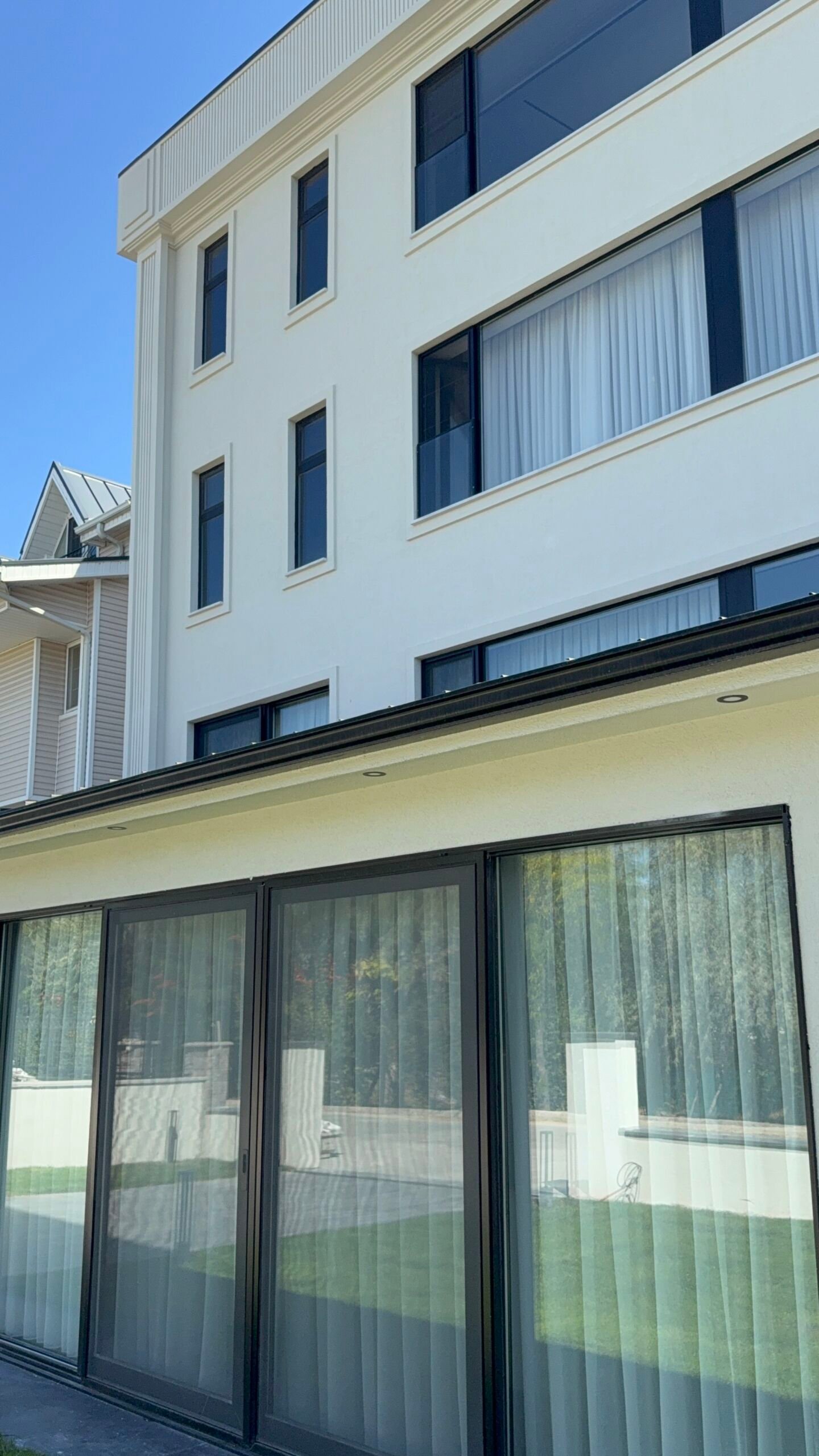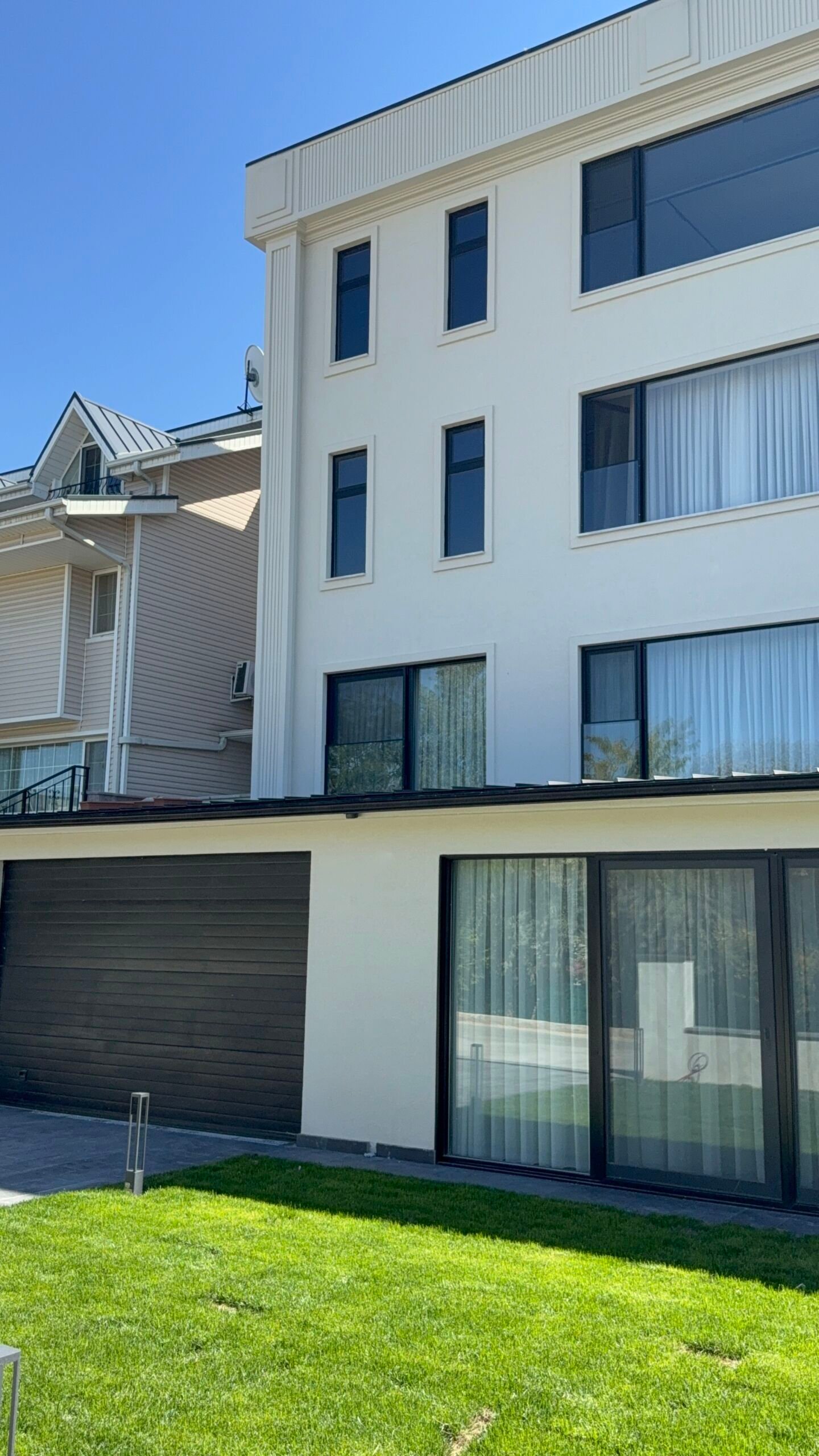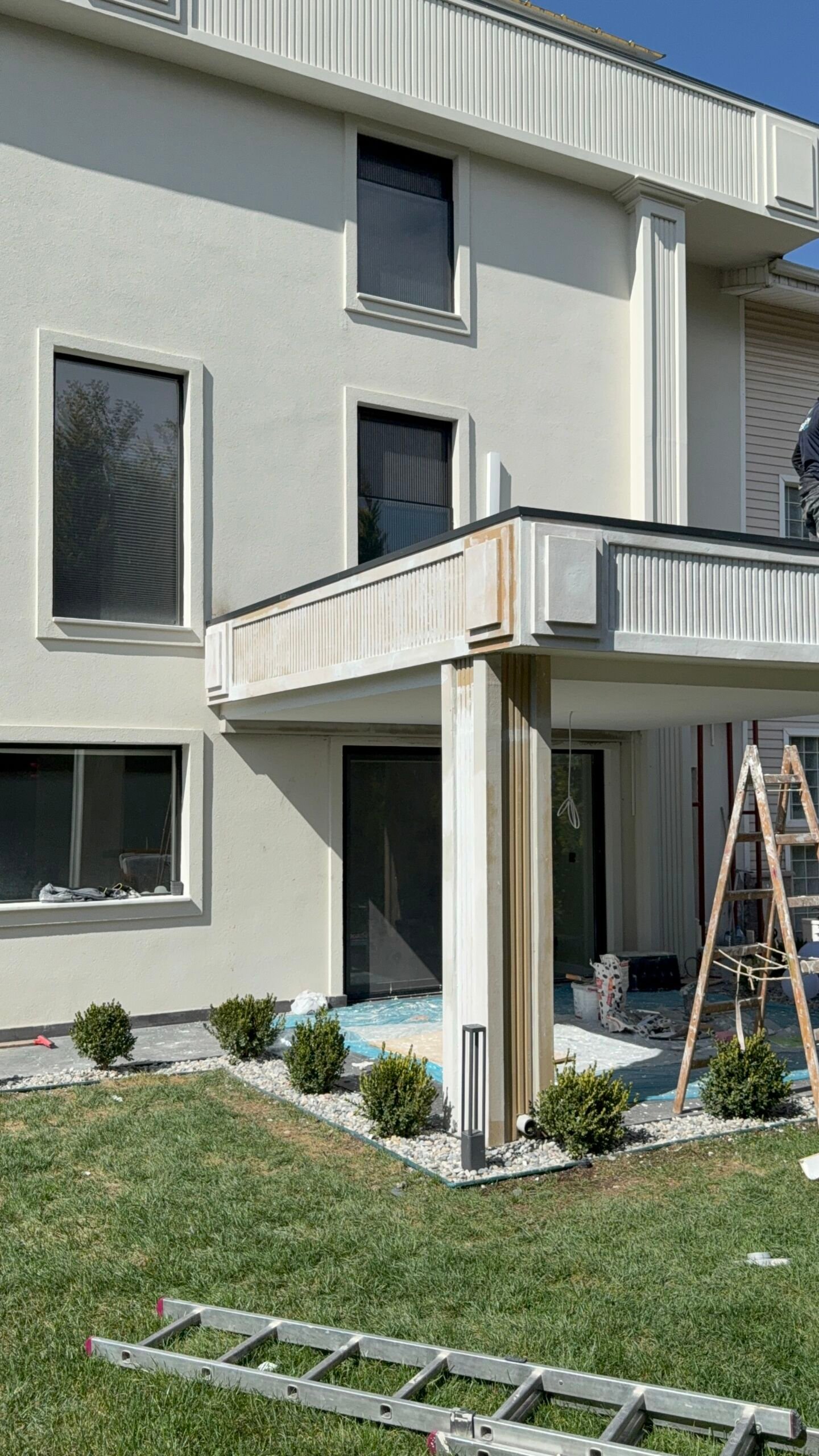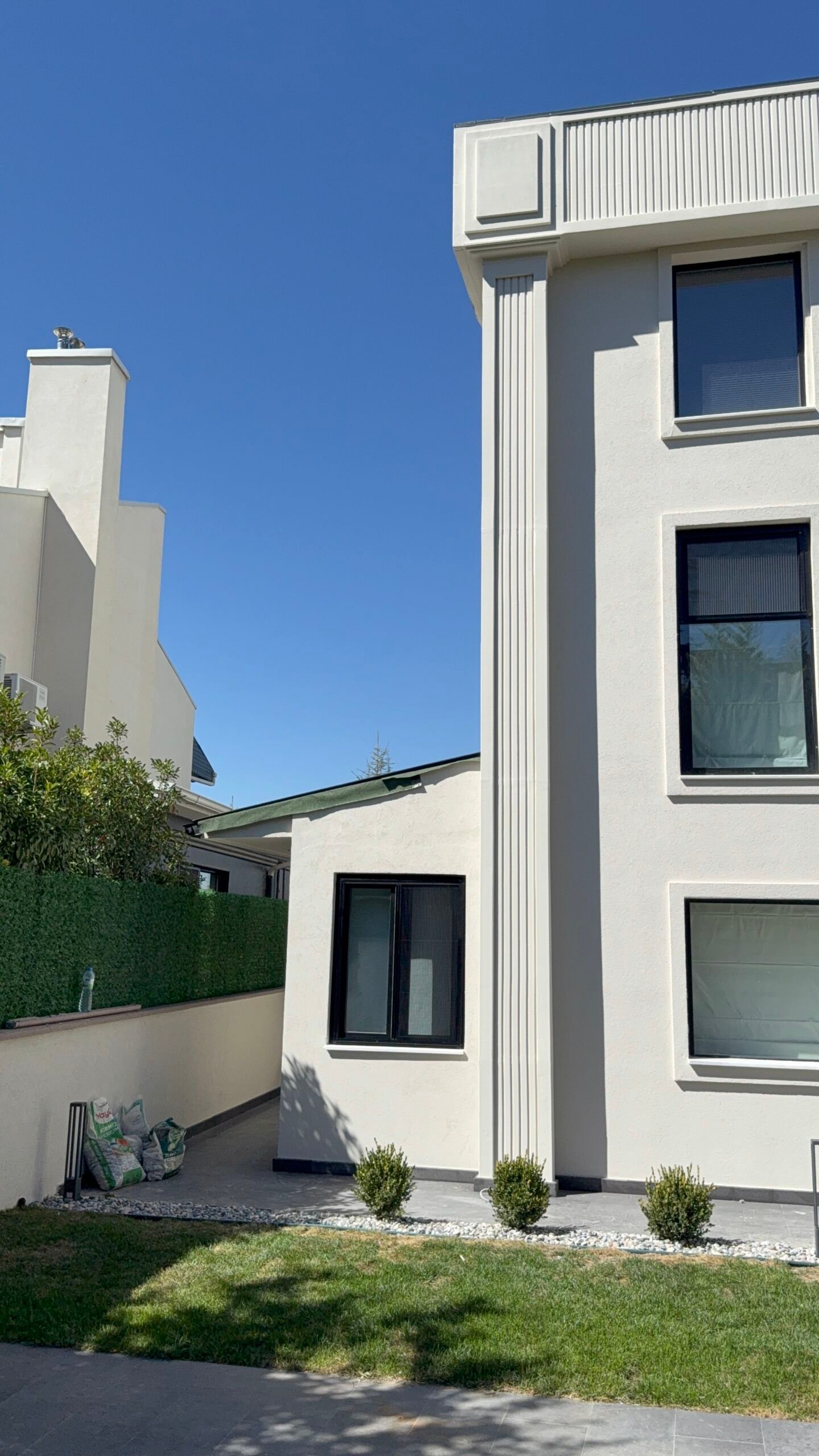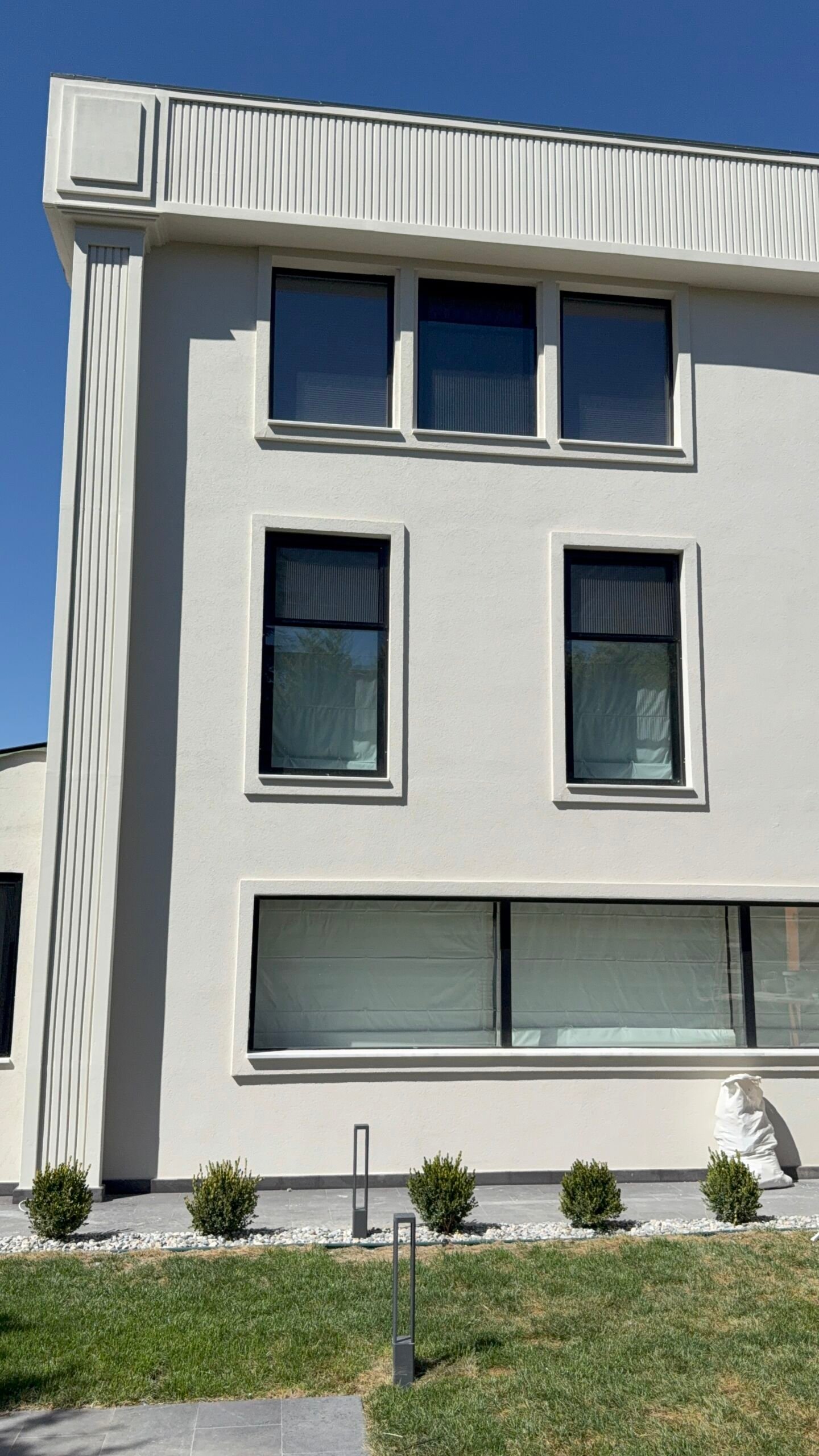 Sanatsal Detaylar: Projeye özel üretilen EPS söveler ve pencere söveleri, mineral sıva ve profesyonel dış cephe boya kombinasyonlarıyla villanın silüeti lüks villa kimliğine büründürüldü.