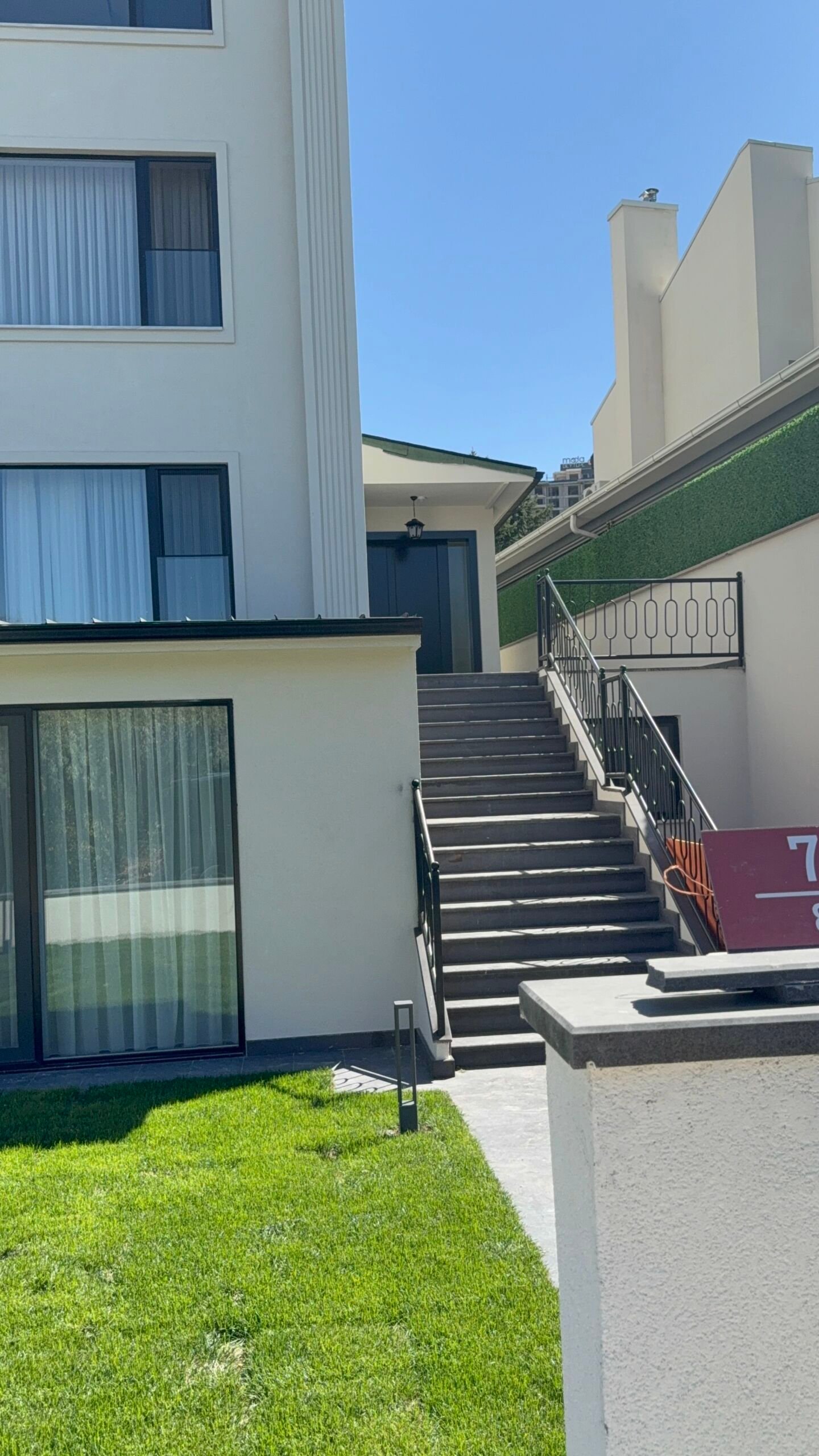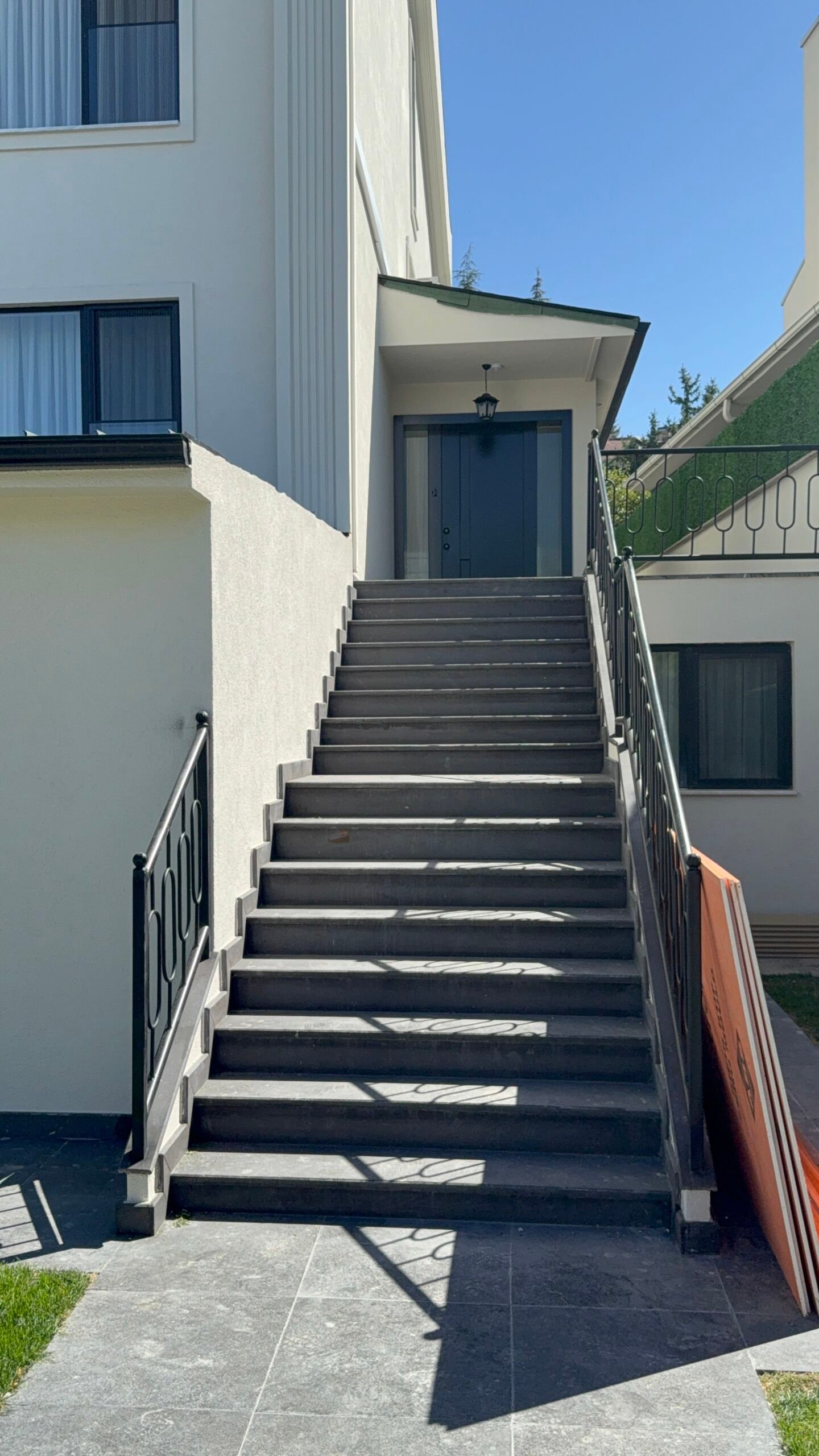 Fiber Cement Sundurmalar: Villa girişindeki sundurma tavanlarında yüksek dayanımlı fiber cement kaplamalar tercih edilerek uzun ömürlü bir estetik sağlandı.